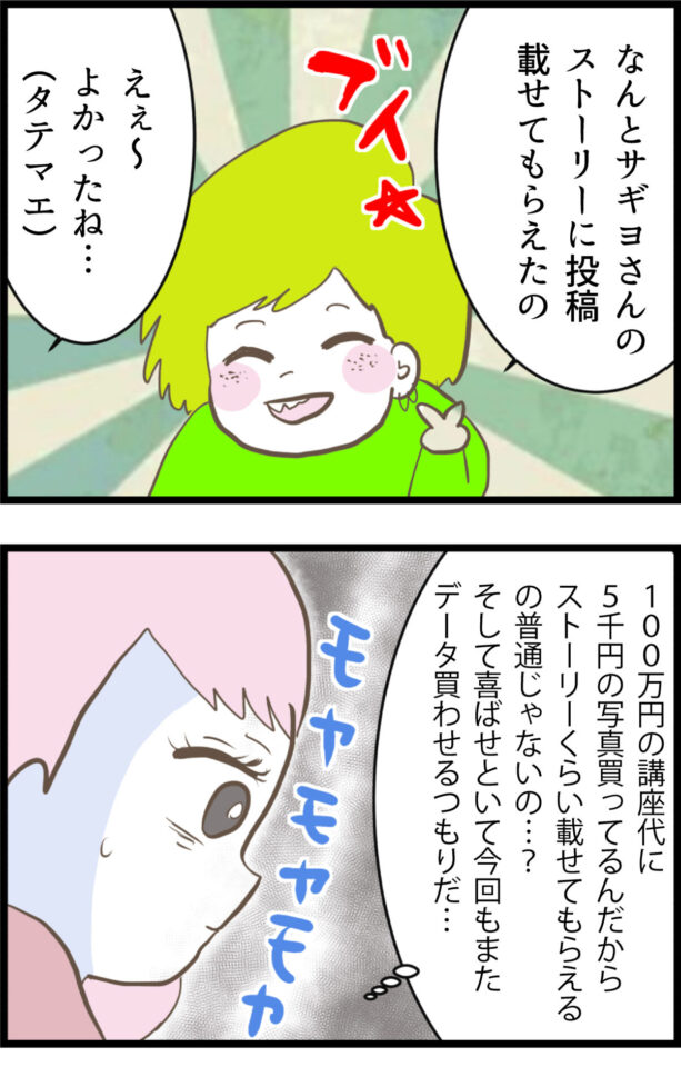 文句言いながらも「ストーリーに載せてもらえた♪」って喜んでるけど、それ完全に「また5千円の写真買わせるための洗脳テクニック」やから!まんまと操られてるー!!