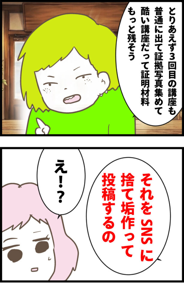 「捨て垢を作ってSNSで告発しよう」と息巻くミドリに圧倒されつつ、「私はただ返金してやめられれば…」と願うはる。