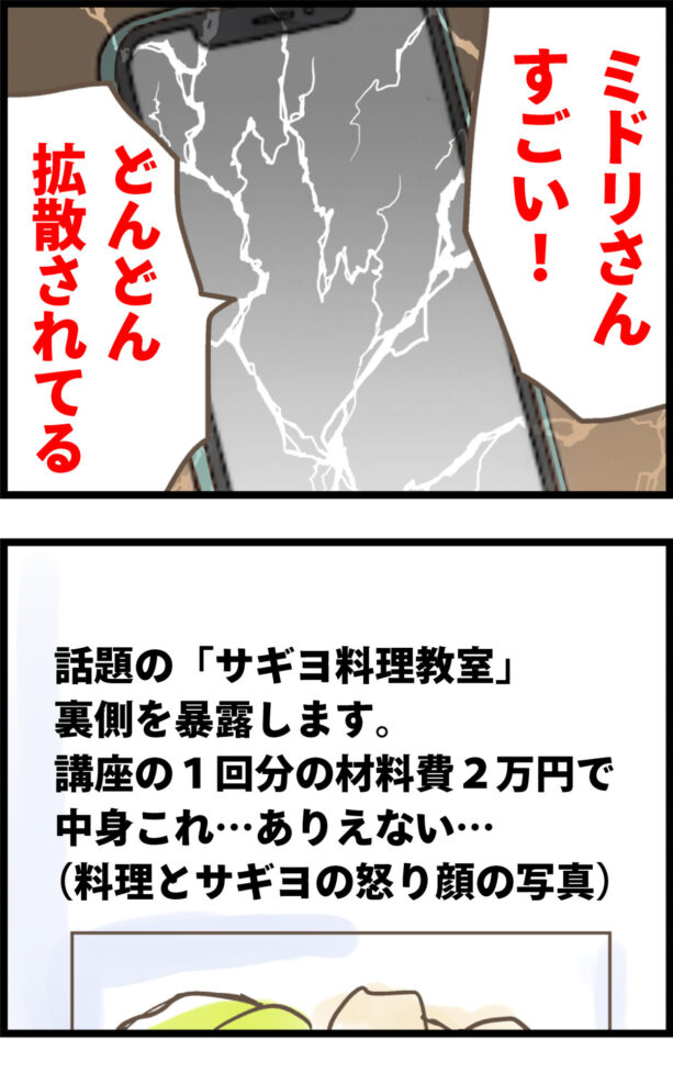 泣き寝入りするかと思いきや、怒りに震えるミドリはSNSの捨て垢を作り、なんとサギヨの実名告発を決行!