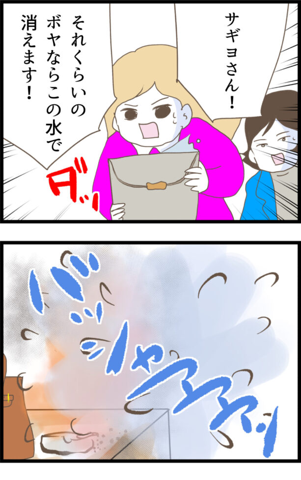 自分のバッグが燃えたことしか頭になくて泣き叫ぶサギヨに、ついに信者たちもドン引きして冷ややかな視線…。そんなカオスな状況で、すかさずスマホ構えて証拠写真撮ろうとするミドリさん、たくましすぎでしょ!完全に自業自得のサギヨ、この後どうやって言い逃れするの!?