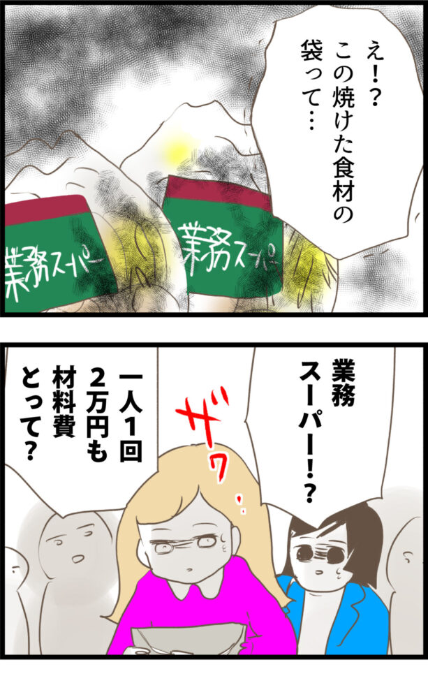 さらに、燃えている食材のパッケージから、100万円の料理教室で「業務スーパー」の激安食材が使われていたことが発覚する!