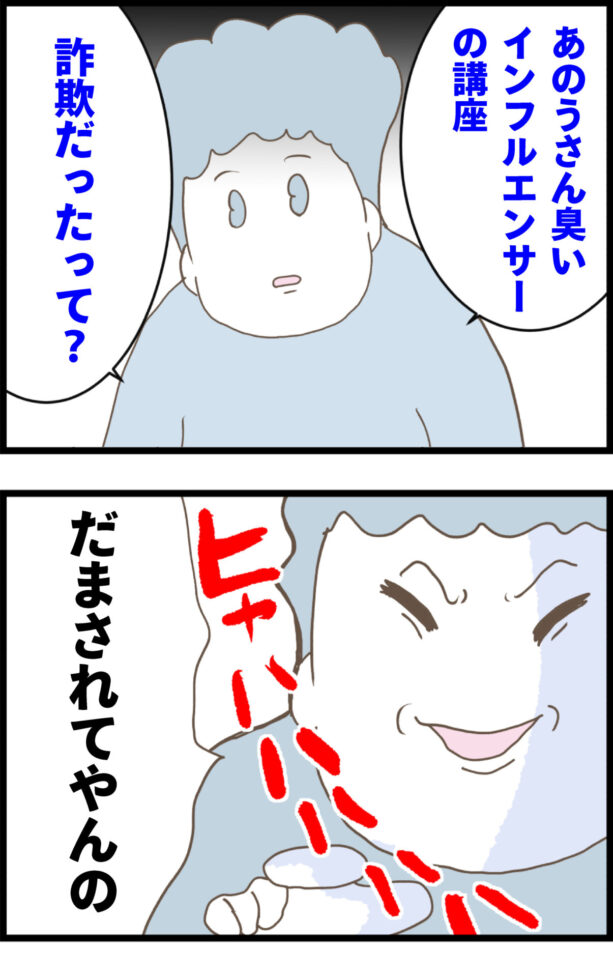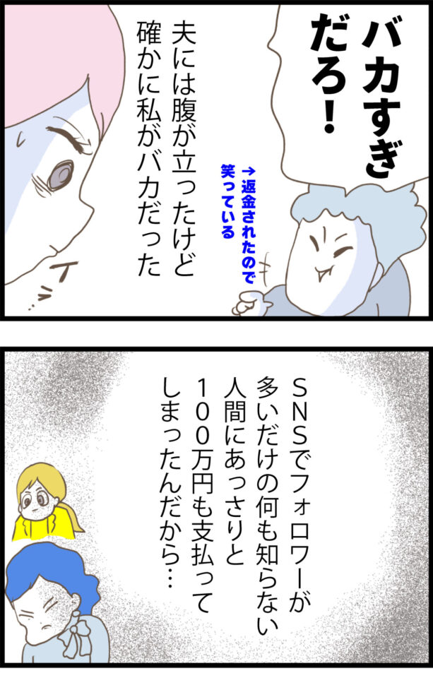 「絶対に返金しない」と逃げようとするサギヨだったが、信者たちにも見限られ、ミドリに炎上の証拠をSNSにアップされ完全に包囲される。