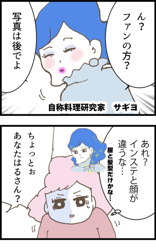 ついにサギヨ本人と対面するも「インスタと顔が違う…?」と戸惑うはる。