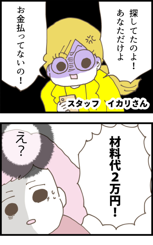 さらにスタッフのイカリさんに呼び止められ、「材料代2万円払ってないのあなただけ!」と初対面でいきなりブチギレられる異常事態に!